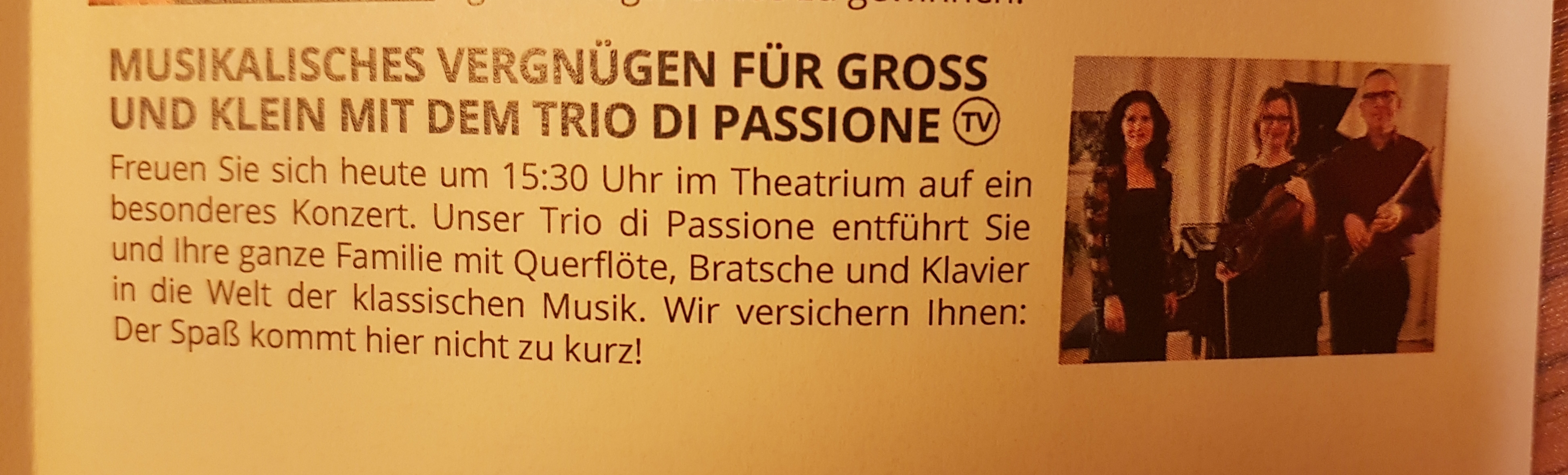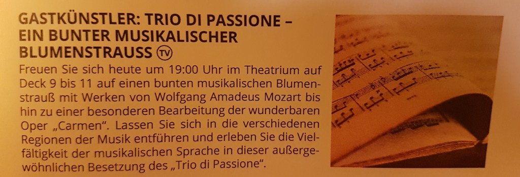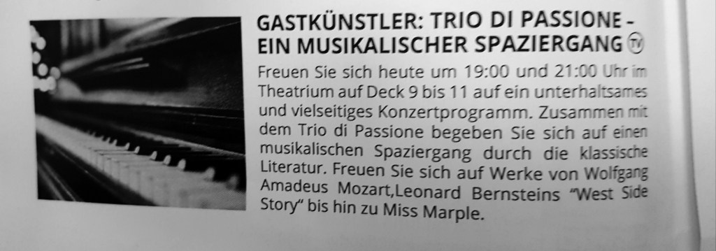 Sommer 2022 Konzerttätigkeit mit unserem Trio Di Passione (Flöte, Bratsche, Klavier) auf der Kreuzfahrt der AIDA/ HIGHLIGHTS AM POLARKREIS