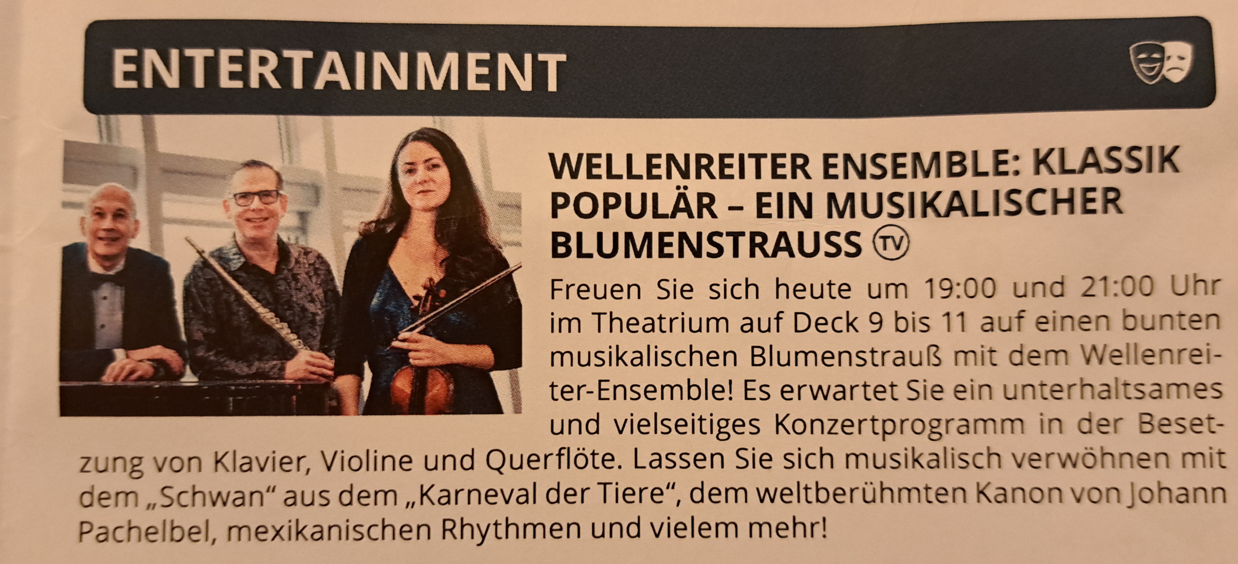 2023, 2024 und 2025 Konzerte mit unserem WELLENREITER ENSEMBLE auf Kreuzfahrten der Aida.