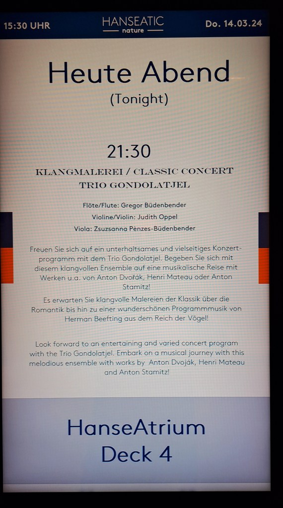 2023 Konzerttätigkeit mit unserem TengerQuartett (Flöte, Bratsche, Klavier und Kontrabass) auf der AIDA Richtung Grönland